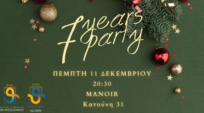 Με μεγάλη χαρά το Δημοτικό Συμβούλιο Νέων Θεσσαλονίκης και το σωματείο των Alumni σας προσκαλούν στο καθιερωμένο μας ετήσιο πάρτι, για να γιορτάσουμε μαζί τα 7 χρόνια ενεργής παρουσίας, πρωτοβουλίας και εθελοντισμού στην πόλη μας! Ελάτε να θυμηθούμε τις δράσεις...