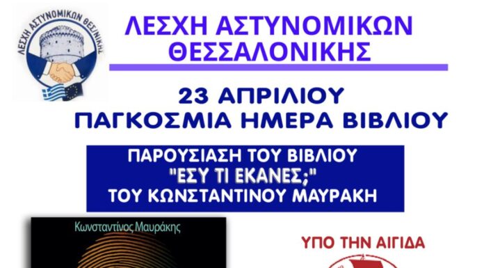 Η Λέσχη Αστυνομικών Θεσσαλονίκης και ο Δήμος Καλαμαριάς, με αφορμή τον εορτασμό της Παγκόσμιας Ημέρας Βιβλίου, διοργανώνουν την εκδήλωση παρουσίασης του βιβλίου "Εσύ τι έκανες;". Η εκδήλωση θα πραγματοποιηθεί στο Remezzo Palace στην Καλαμαριά, την Πέμπτη 23...